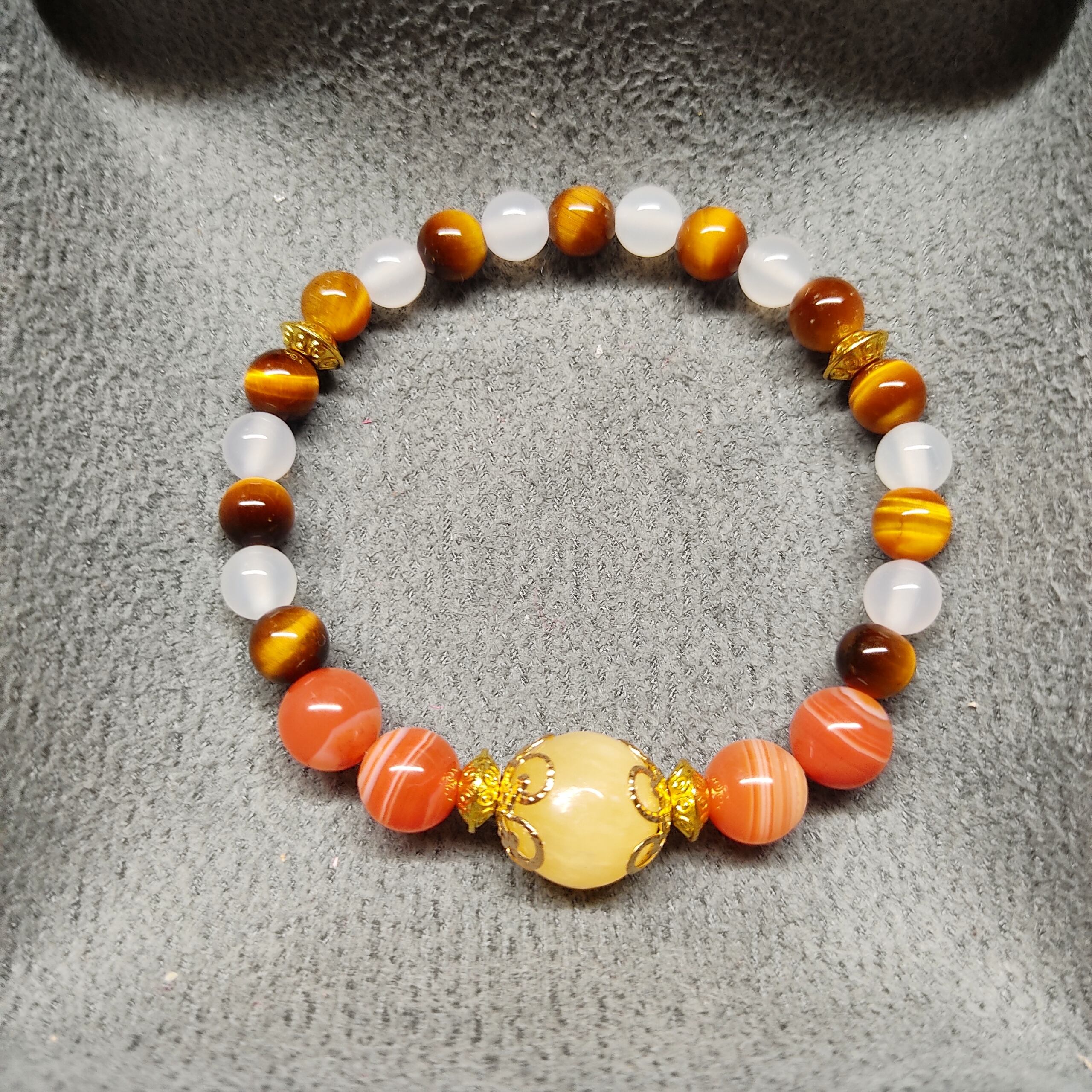 かわいい蜂蜜の飴玉のようなアラゴナイトを花座で飾り、ストライプが特徴のサードオニキスやタイガーアイで蜂の模様をイメージしました♪